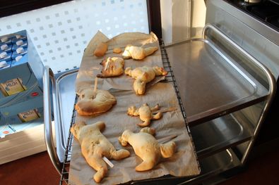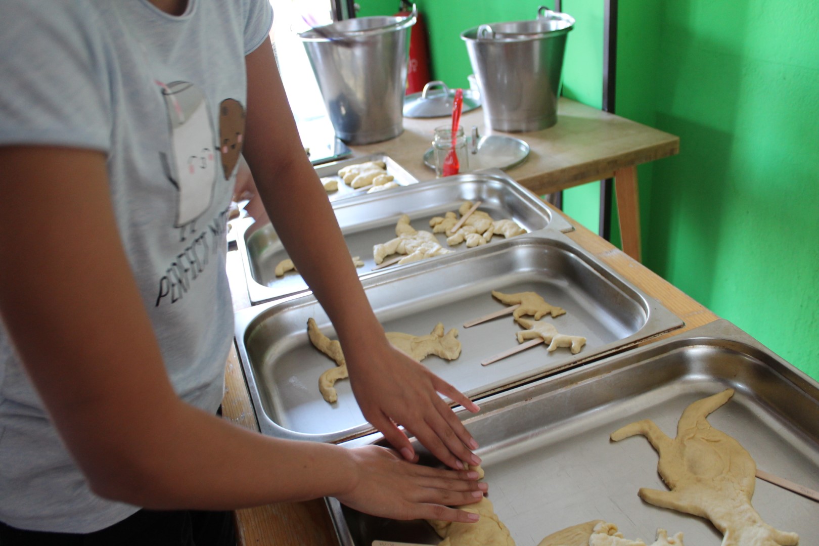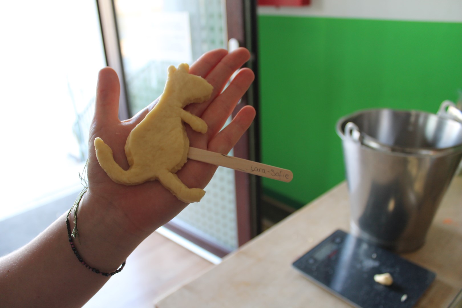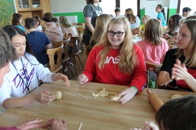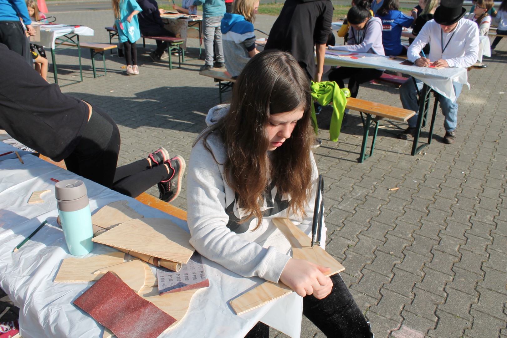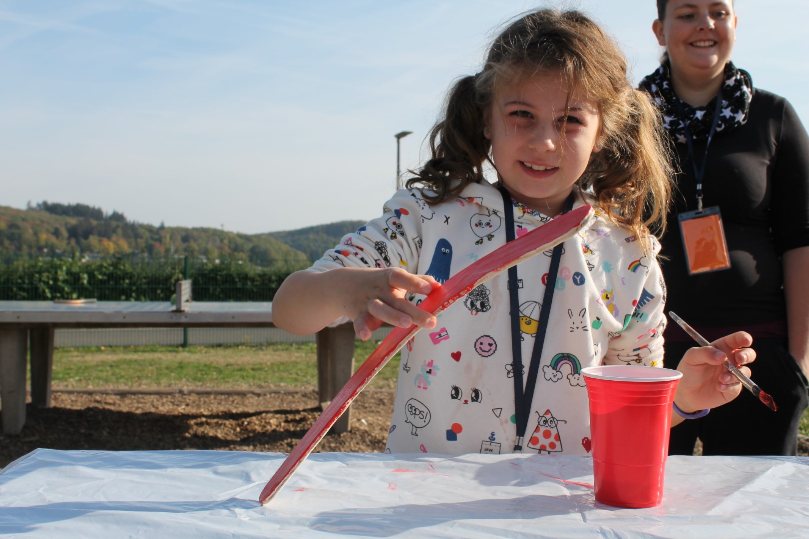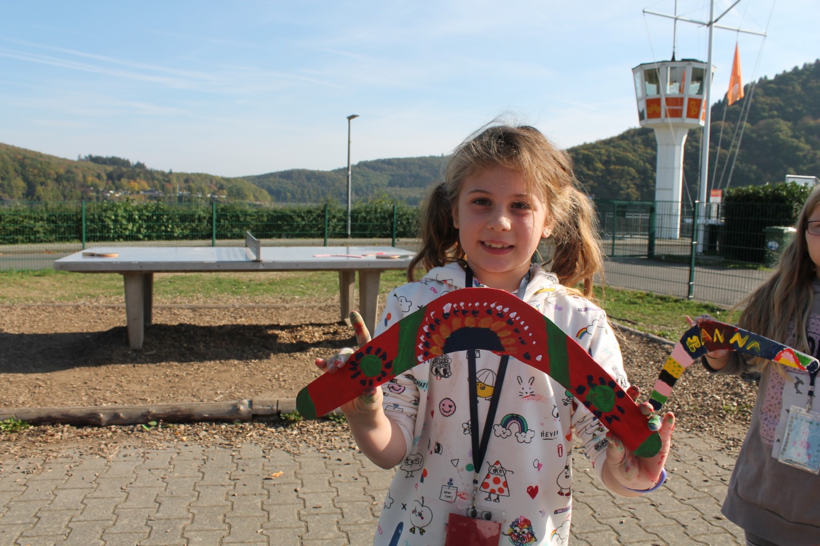 Anschließend sind wir in unseren Australien Tag gestartet. Als erstes haben wir uns für den Tag gewappnet, indem wir Boomerangs gesägt, geschmirgelt und bemalt haben. Das Wetter des Tages war so gut, dass wir alle gemeinsam in der Sonne draußen Mittagessen konnten. Wir haben gegrillt und als Nachtisch gab es Berliner.